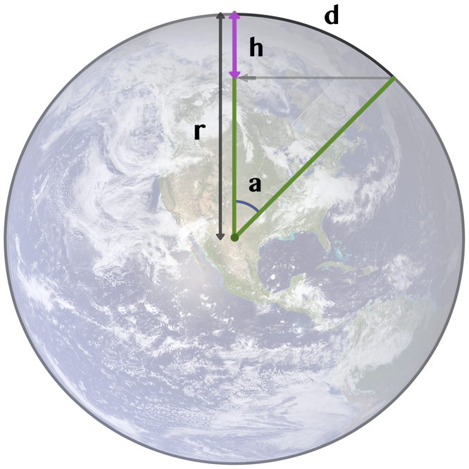 Accurately calculate the curvature you are supposed to see on the ball Earth. Uses a cosine function, works for all distances in both kilometers and miles.