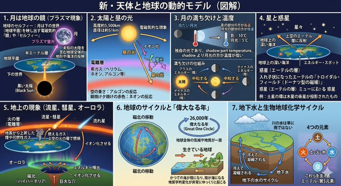 ・Daylight (Plasma Light): As the Sun moves, rare gases in the ionosphere (helium, neon, argon, etc.) ionize and fluoresce, creating “daylight.” The blue sky is due to argon, and the red of dawn or dusk is from neon reactions.