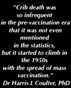 • Since at least 1933, the medical community has known that vaccines cause infant deaths. To conceal this, those deaths were renamed “crib death” and then “Sudden Infant Death Syndrome” (SIDS), eventually being attributed to infants not sleeping on their backs
